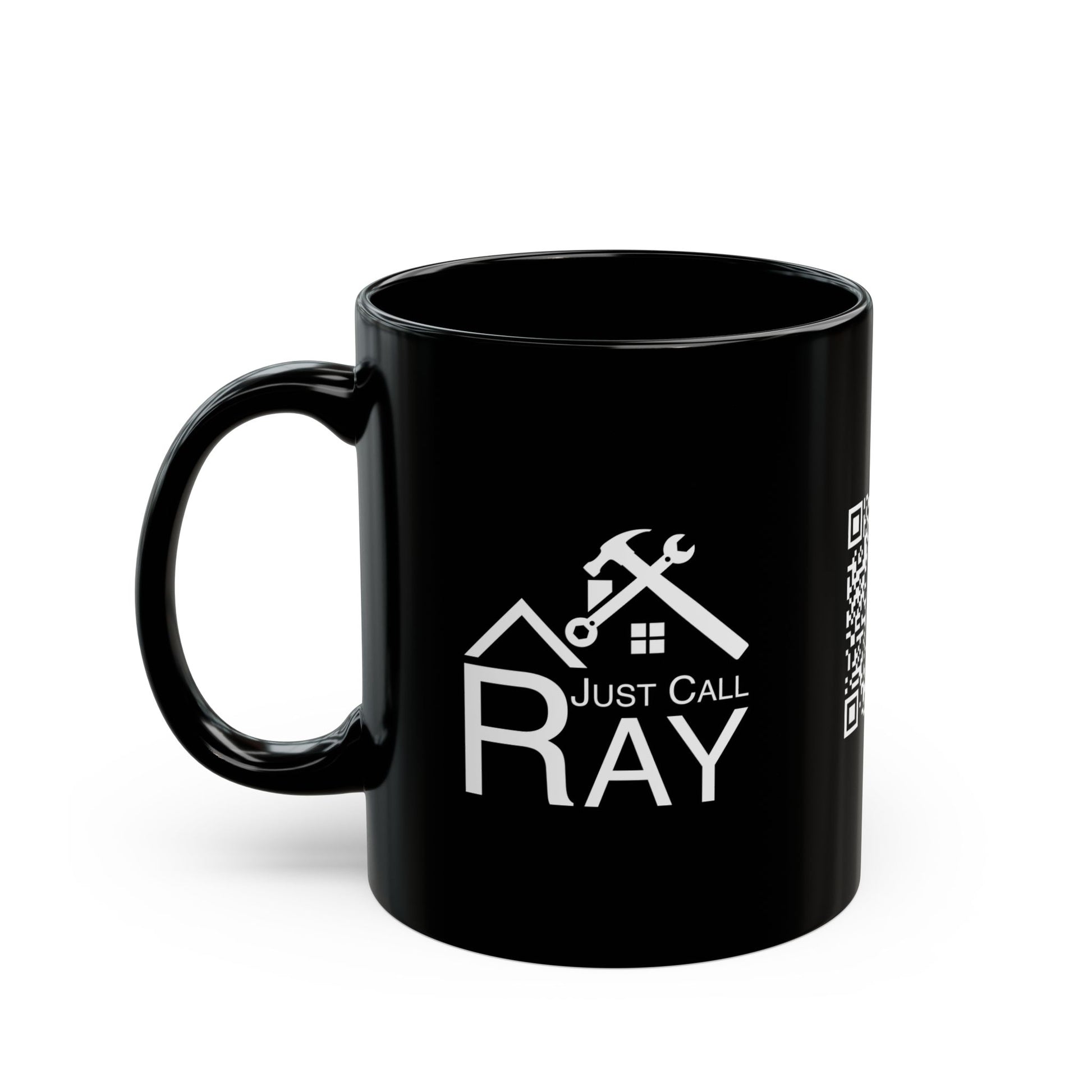 A glossy black ceramic mug with a bold blue wrap design that reads "Just Call Ray" alongside home repair icons — a small, practical piece that feels like a friendly nod to the neighborhood handyman. Warm steam rises from fresh coffee as the white logo contrasts crisply against the deep blue, making each sip feel like a short break between projects or a quiet moment after a job well done. It sits comfortably in a C-shaped handle, sturdy and familiar on workshop benches, kitchen counters, or office desks. This mug speaks to people who appreciate straightforward utility, small-business pride, and a touch of everyday personality in their drinkware. Whether used during early morning tune-ups, client visits, or a slow weekend at home, it carries a sense of dependable craft and down-to-earth charm.